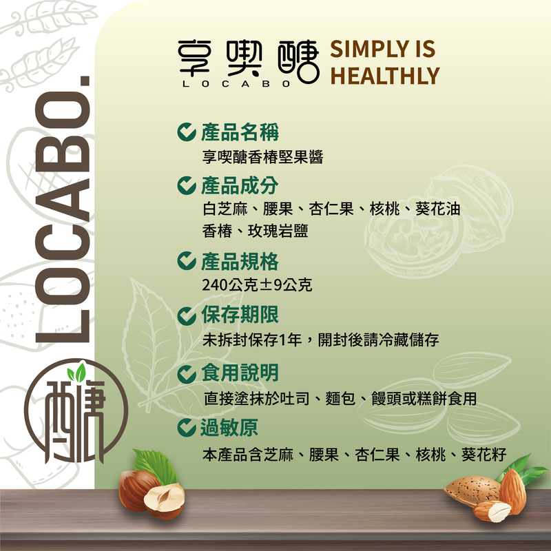 ●成分:白芝麻、腰果、杏仁果、核桃、葵花油、香椿、玫瑰岩鹽