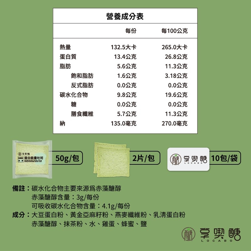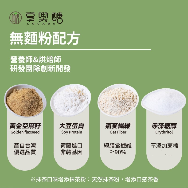 ●成分:大豆蛋白粉、黃金亞麻籽粉、燕麥纖維粉、乳清蛋白粉、赤藻醣醇、抹茶粉、水、雞蛋、蜂蜜、鹽
