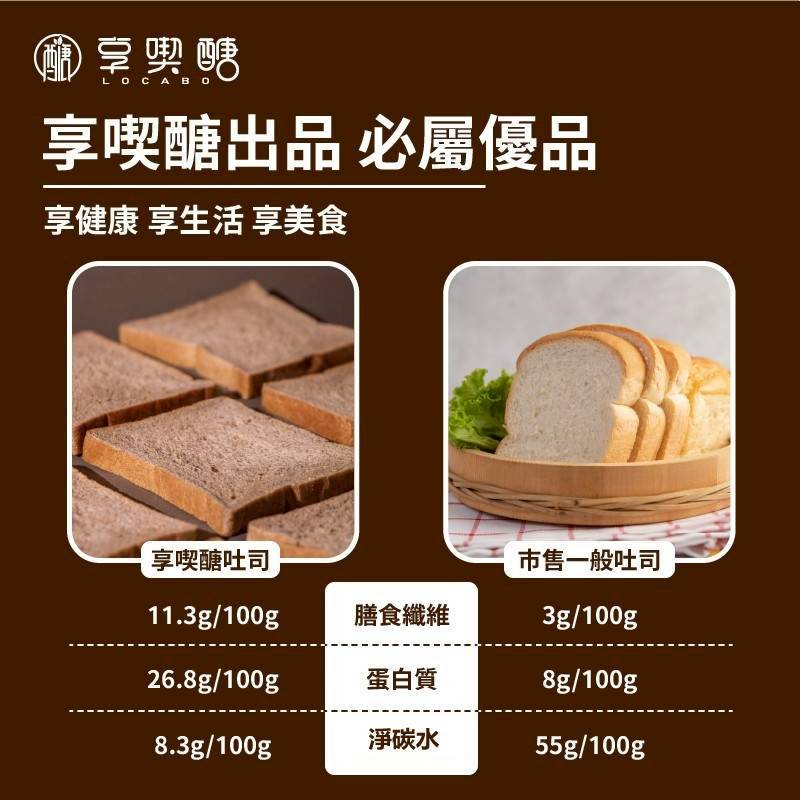 ●營養標示(以1份為單位,一條吐司含10份):熱量132.5大卡,淨碳4.1克,膳食纖維5.7克,蛋白質13.4克,脂肪5.6克