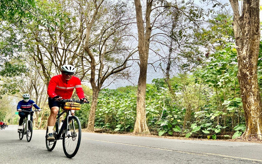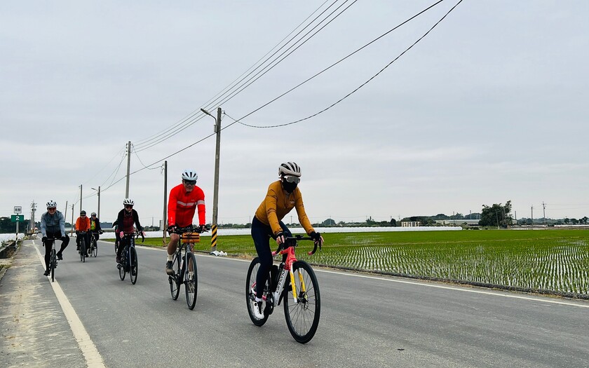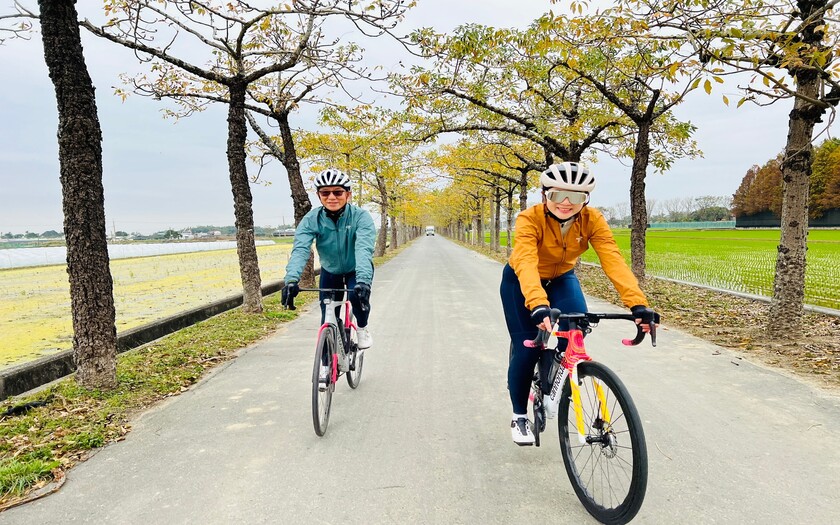 離開白人牙膏將軍府,我們直驅林初埤,這裡的木棉花綠色隧道每年在三至四月間綻放如火的花海,現今道路兩旁的木棉樹綠意盎然。而接下來的竹門綠色隧道與玉豐芒果樹綠色隧道,則換上不同色調的綠意,日治時期種下的芒果樹如今已成高聳蒼鬱的綠蔭大道,騎行其間,猶如穿越一條幽靜時光廊道。連續三段綠隧讓大家心曠神怡,沉浸在這片春日的生機中。