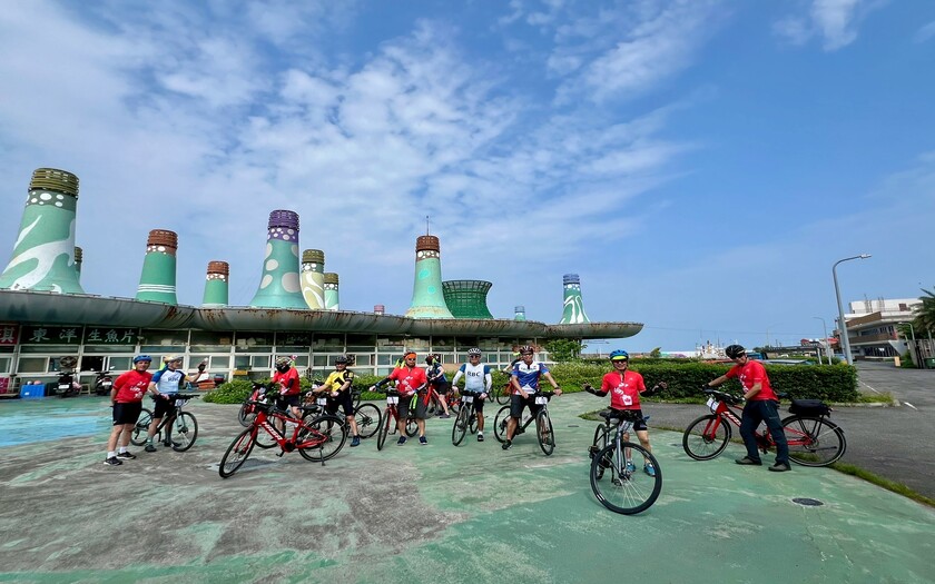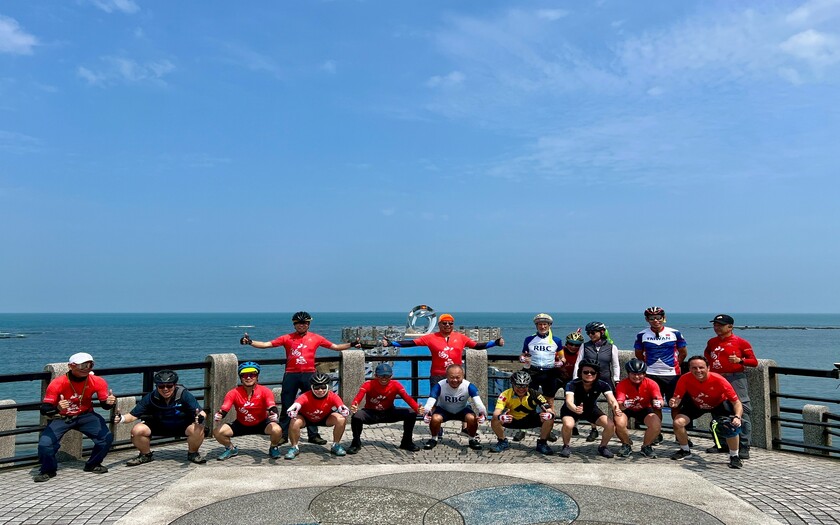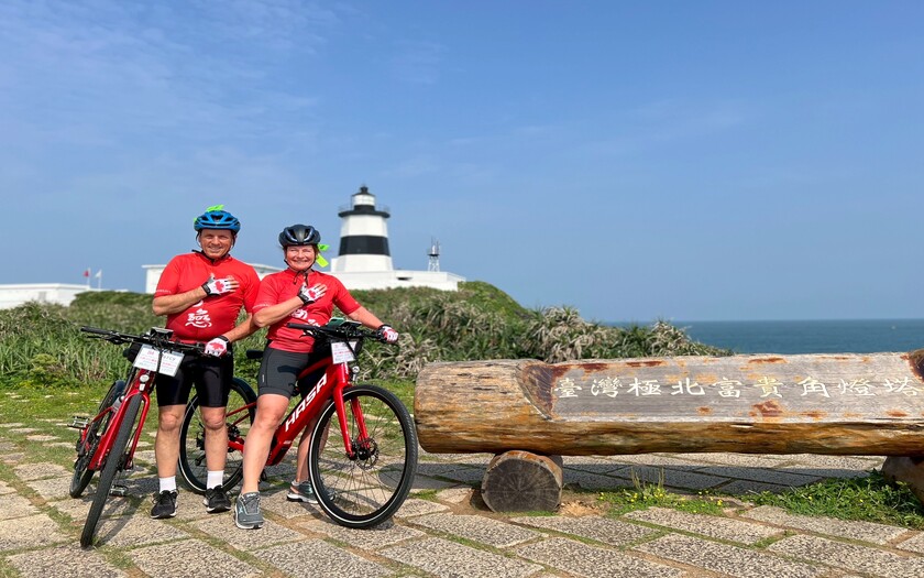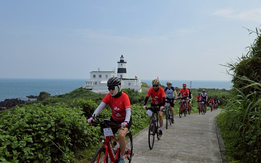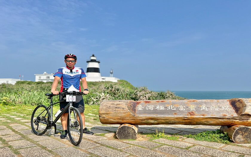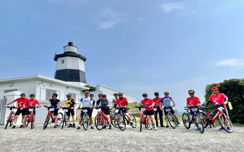 一早8:20,團員們在富貴角公園集合暖身,迎著微風緩步騎向富貴角燈塔。這座燈塔不僅是台灣四極點之一,更是日本人在台灣興建的第一座燈塔,立在東經121°14'、北緯25°18'的海角之上,見證台灣航海史的起點。