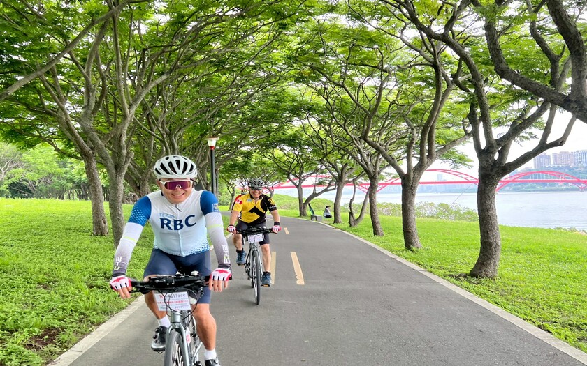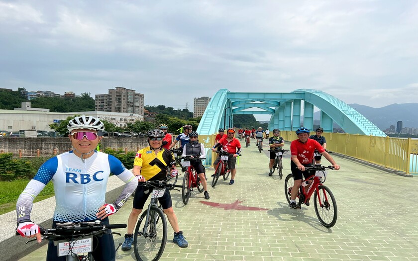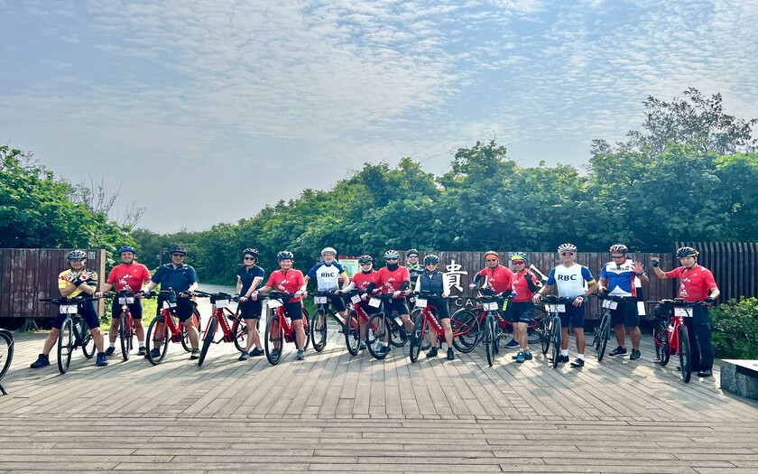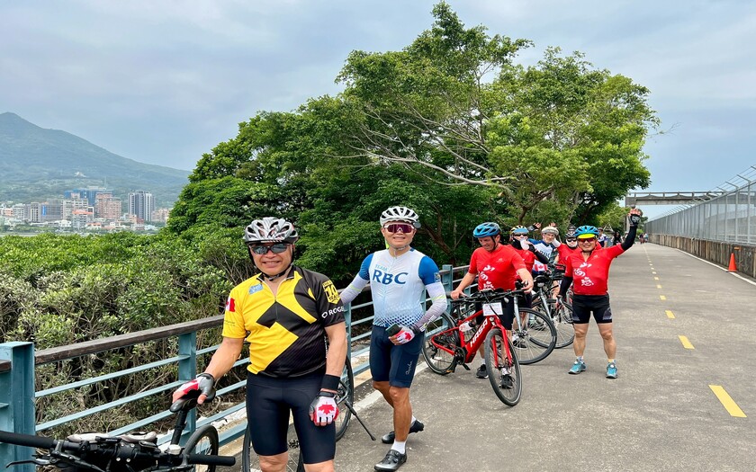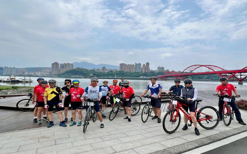 接著途經紅色拋物線鋼拱橋的關渡大橋,橋面如彩虹般優美,映著觀音山的壯麗背景,讓加拿大團員紛紛停下腳步拍照;而在成蘆橋下的東西南北石,大家看著這座標示四方的石碑,對台灣自行車道的縝密規劃直呼用心。