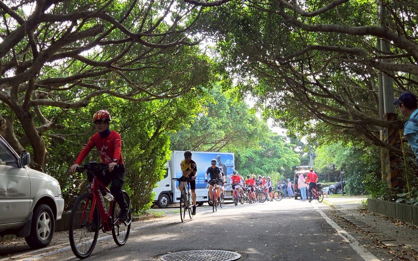 下半天騎入三峽與五寮河畔,這片區域日治時期名為「三角湧」,溪流匯聚,三面環山,終年雲霧繚繞。講解時提到清光緒年間「築隘設寮」的歷史背景,以及「五寮」名稱的由來,讓加拿大車友感受到濃厚的文化底蘊,也更認識這塊土地背後的故事。