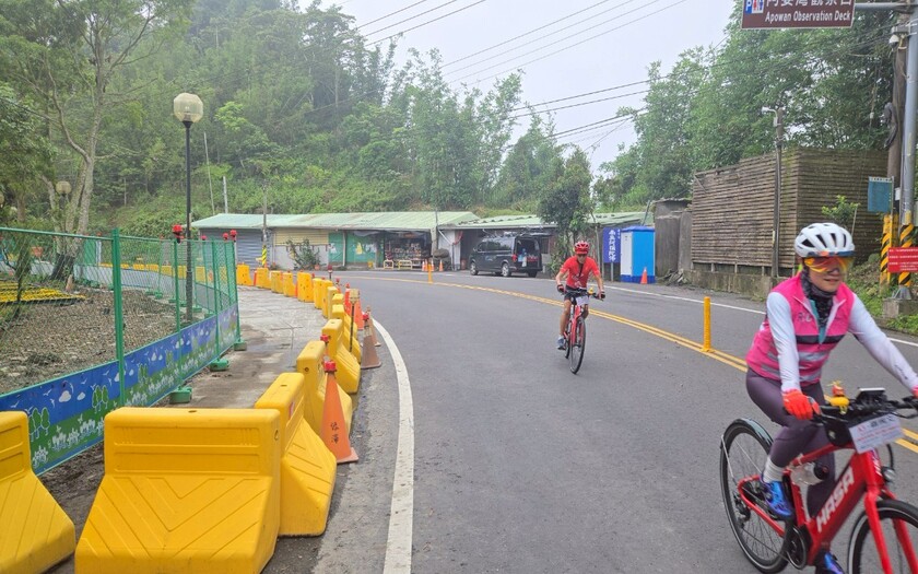 接著沿台三線前行,來到許多車友口耳相傳的【阿婆彎】。這裡因為一位可愛的「幹譙阿嬤」以台味十足的「騎卡慢欸!」紅遍車友圈,成為台三線上的另類精神地標。此處正在施工中,圍上黃色施工圍檔讓這個大彎更為醒目。