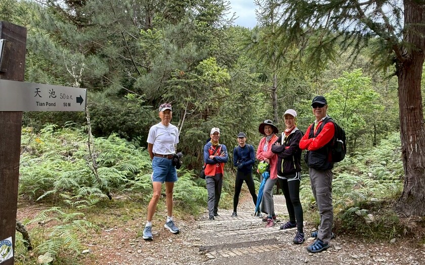 從祠旁拾階而上,來到被譽為「南橫明珠」的天池,雖是高山沼澤,湖面平靜如鏡,倒映群山之姿。我們從此展開3.5公里「中之關古道」下行健行。這段古道原為關山越嶺道的重要路段,如今成為見證舊時行旅與南橫開發史的絕佳途徑。大家一邊行走,一邊聆聽導覽分享的築路故事與布農族傳說,彷彿穿梭時光隧道。