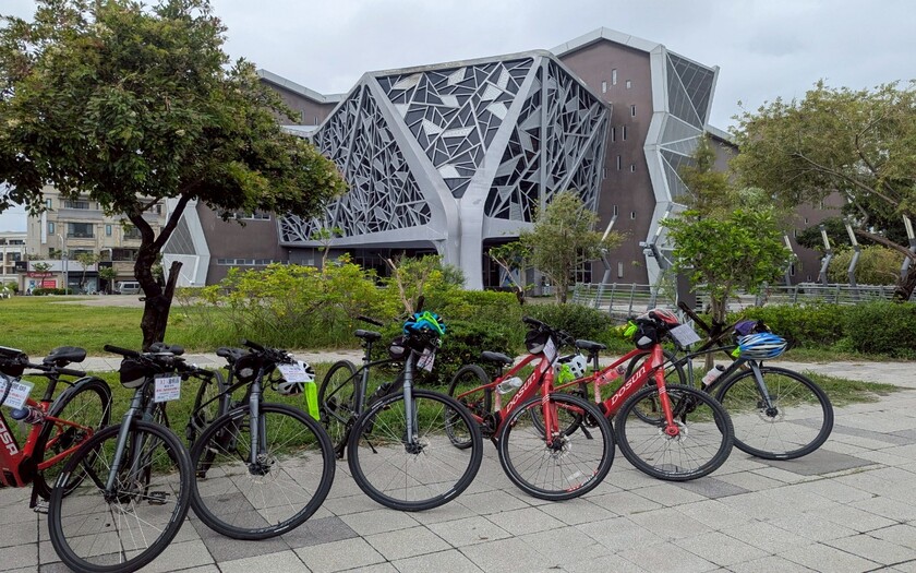 穿梭在雨絲與車流間,我們觀察到台南人上班的節奏,比想像中悠緩許多,這份從容也讓單車隊伍能有序前進。從六甲頂、洲仔尾、鹽行騎到永安橋,沿途皆是寧靜又具歷史氛圍的鄉鎮風貌。來到台灣歷史博物館,只能在園區外繞騎、遠觀「世界中的臺灣」主題建築,因為週一休館,只能與博物館擦身而過。