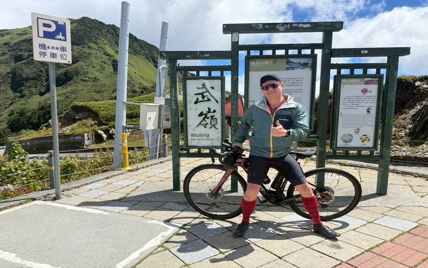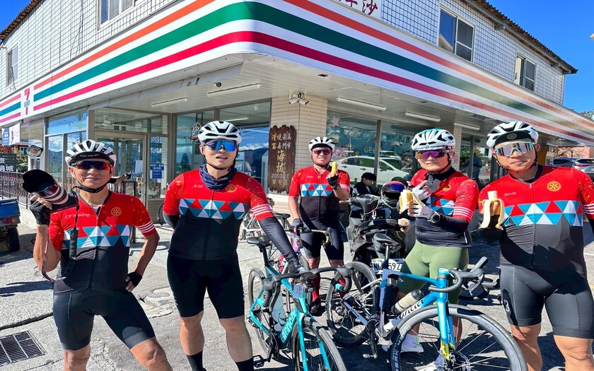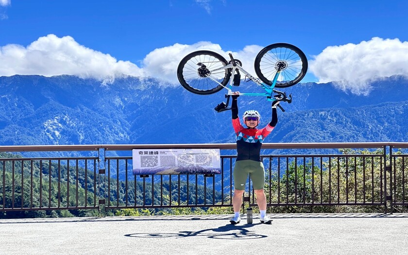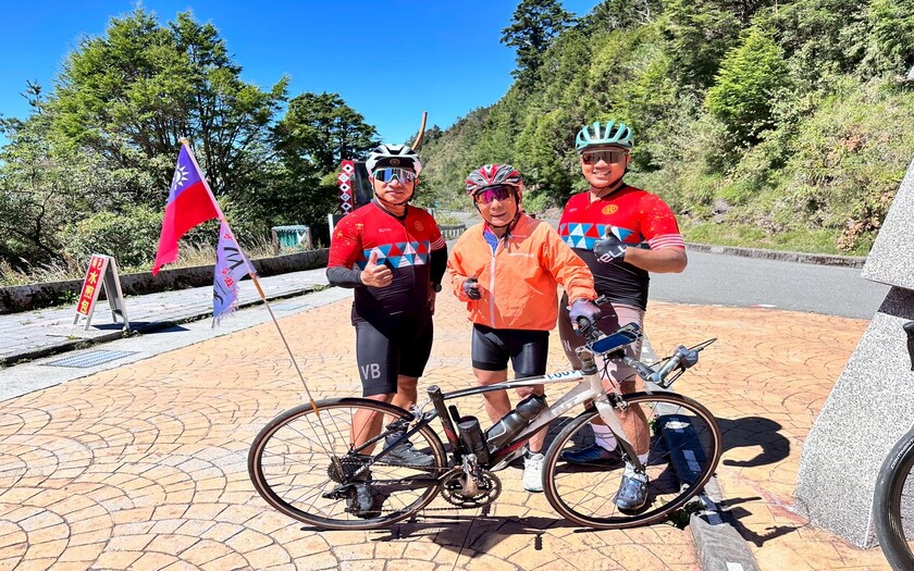 12:10,全隊抵達海拔 3,275 公尺的武嶺。這是台灣公路的最高點,也是單車人心中的殿堂。汗水與意志在此凝結成榮耀的勳章。當武嶺獎章掛上胸前,教練也端出一份驚喜——為壽星郭秋梅與馬志朋準備的生日蛋糕。群山環抱、雲海作伴,在這樣的高度唱生日歌,笑聲與感動交織成最獨特的回憶。
