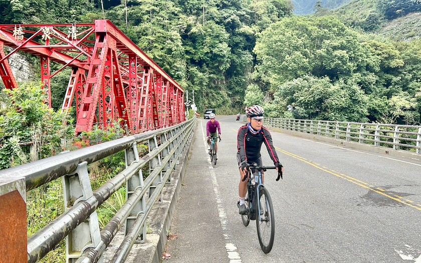 下坡來到大甲溪支流南湖溪谷的紅色 清泉橋(台7甲線 65 公里處)。這座退役鐵橋為紀念徐蚌會戰中犧牲的邱清泉上將而建,橋身鋼材由法國艾菲爾公司設計、西德建造,仔細觀察還能看見鐵塔圖騰,如同歷史的見證。