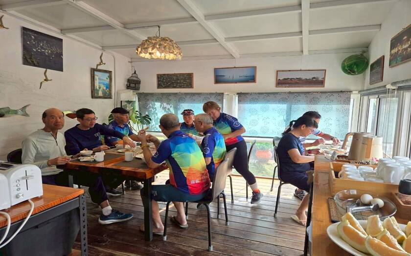 經過昨夜探訪「台灣極西點・國聖燈塔」後,今早終於迎來久違的「睡到自然醒」。七股的晨光從窗簾縫隙灑進來,海風帶著鹹味與寧靜08:30,車友們享用由老闆娘阿娟親手準備的豐盛早餐——鮮味十足的海鮮粥與西式餐點,暖胃又暖心。
