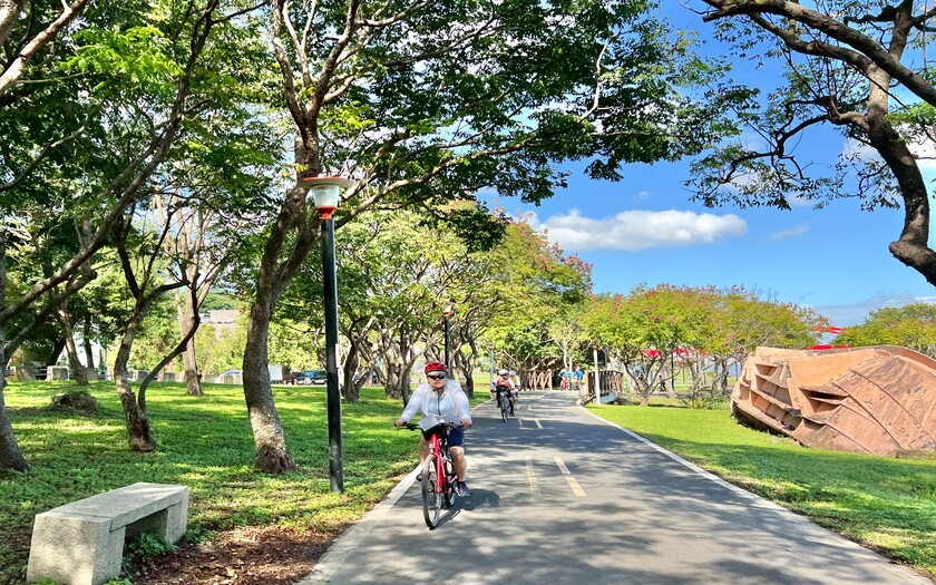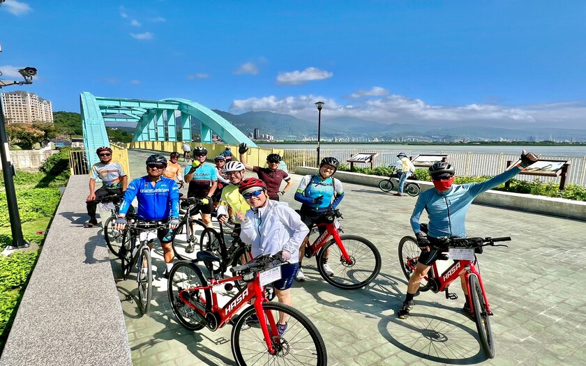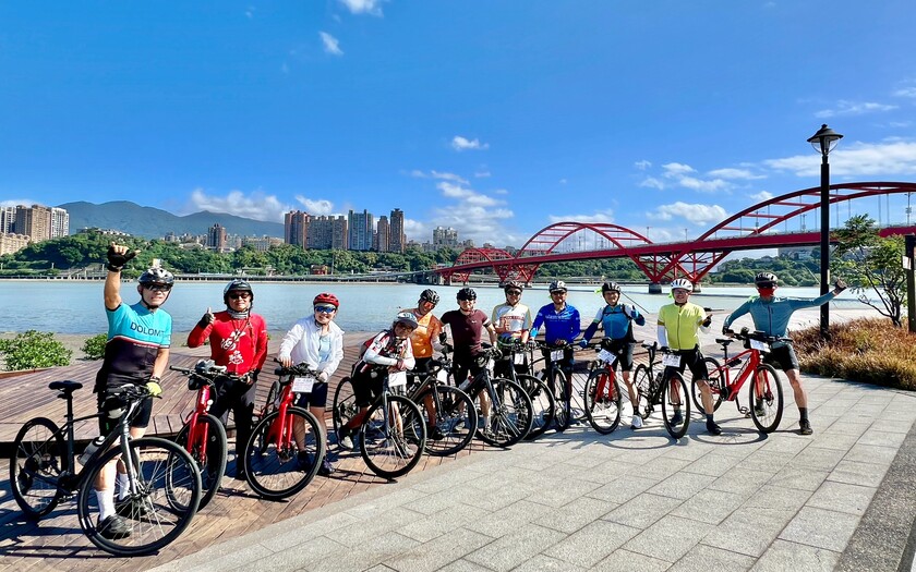 繼續前行,車輪滑過鮮紅色的關渡大橋。這座拋物線鋼拱橋如跳躍在淡水河上的彩虹,背景襯著觀音山,每一次騎過都令人心情被打開。前段路因車流密集,車友們無不精神緊繃;但抵達紅樹林後順利接上河濱單車道,終於能以輕鬆的節奏欣賞淡水河岸的美景。