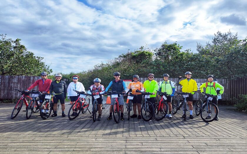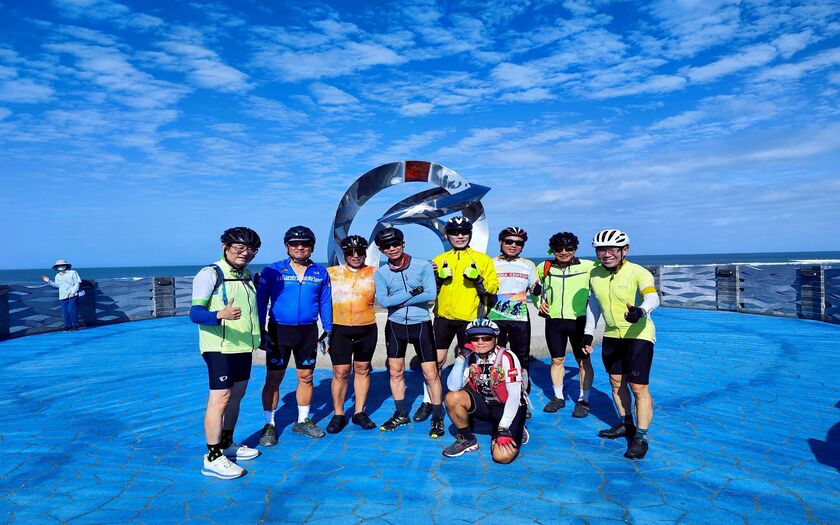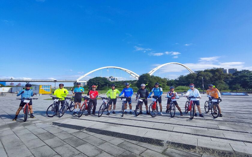 離開燈塔不久,就騎進石門婚紗廣場。2008 年啟用的純白地景,搭著北海岸湛藍海天,是新人拍照最愛的幸福地標,也替隊伍的前段路程添上一抹優雅亮色。車隊在芝蘭公園短暫拍照,海天一色的風景讓人心情大好。抵達紅樹林捷運站時,馬教練已提前在此等待,從這一刻開始由他帶領全隊穩定前進。