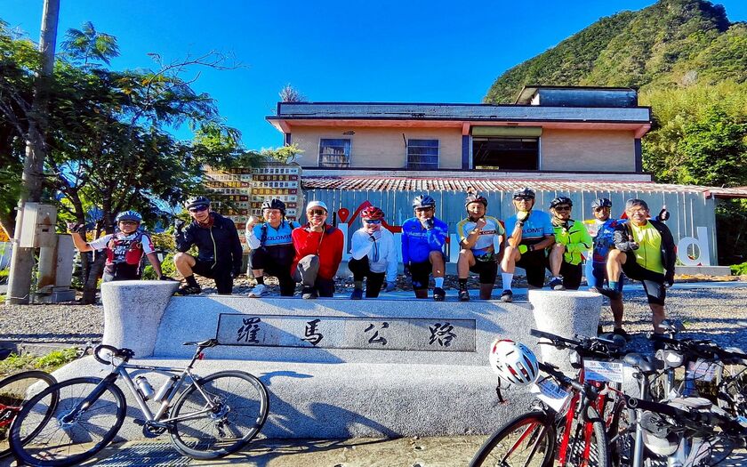 復興雙橋後在羅馬公路口合影。這條以彎道柔順、景致秀麗著稱的道路,是單車界相當知名的山線經典,也象徵著我們正式進入中央山脈的門廊。短暫休息後,我們來到榮華大壩。這座半月形水壩不只是農田生命線,更肩負防洪與攔砂功能,遠望氣勢壯闊。