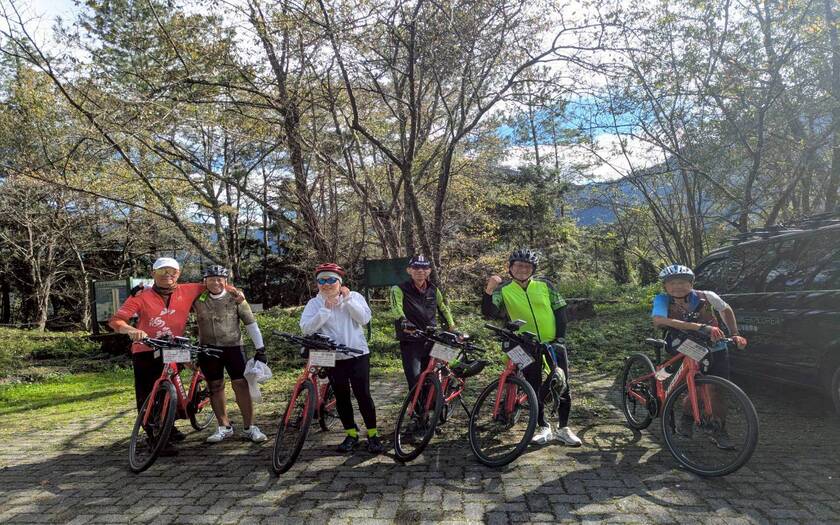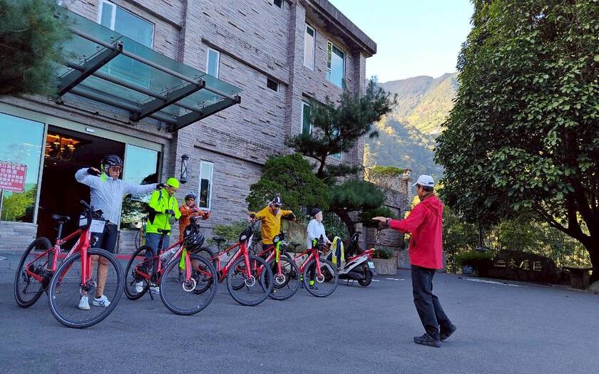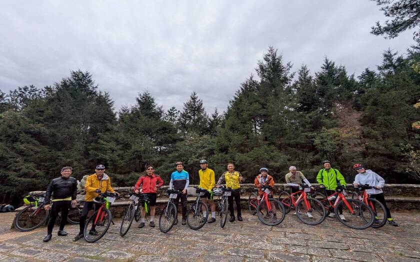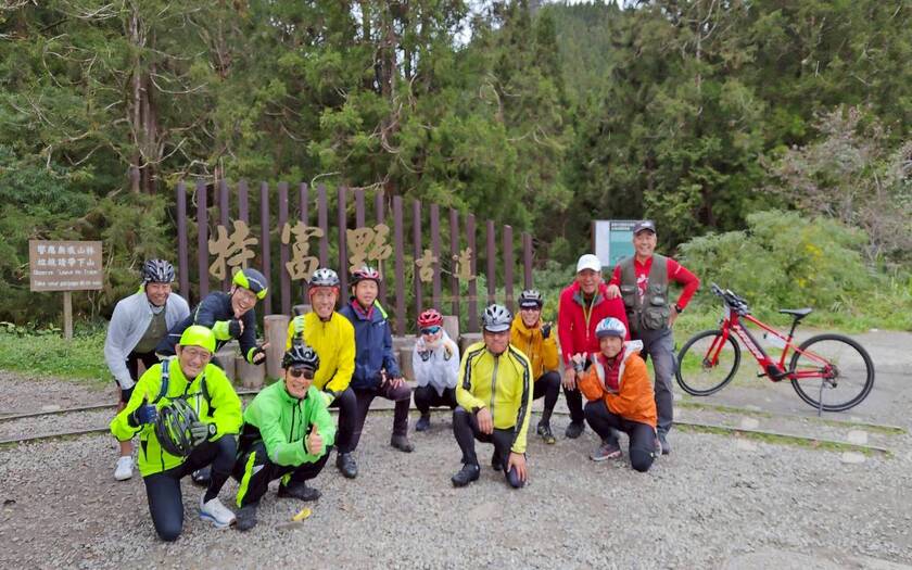 玉山守望的一日|塔塔加・夫妻樹・鹿林神木・阿里山早晨從東埔的沙里仙溫泉渡假村出發,天氣清朗微涼,隊伍依計畫兵分兩路:一般車搭車至台21線124K附近開始起騎,電輔車隊則由飯店出發,沿途經過日月雙橋、望高茶園,一路朝玉山方向前進。今日原預期在 132K 需配合整點放行,所幸工程臨時取消,大家瞬間卸下時間壓力,能真正將目光放回眼前壯闊的山景。
