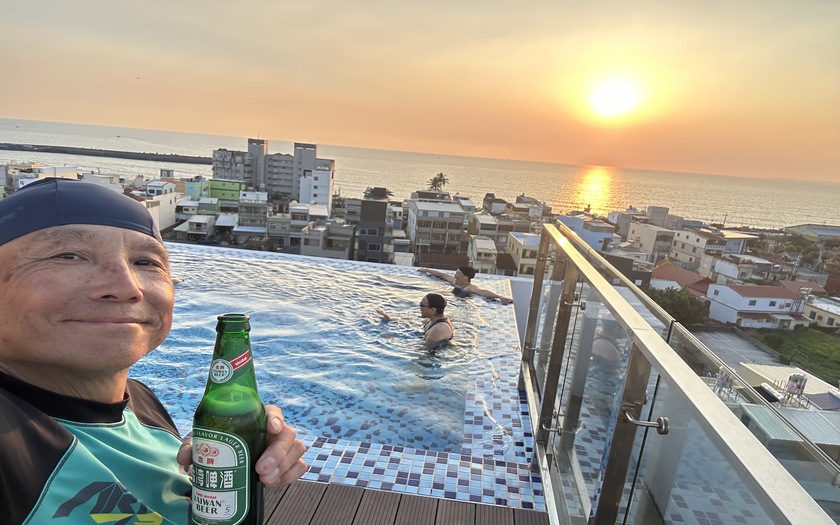 傍晚抵達 枋客文旅。頂樓的無邊際泳池,是許多人專程朝聖的亮點。夕陽從海平面落下,染紅整片天際;車友們坐在池畔邊聊天、放鬆、拍照。結束了連日的山岳挑戰後,今日以一場完美的夕陽儀式,替大家的旅程畫上一個圓滿又美好的句點。