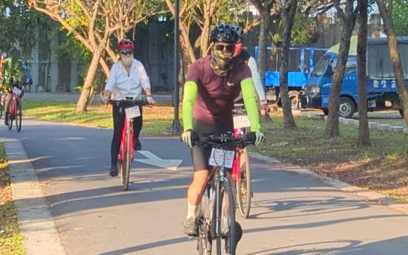 從旗山出發,陽光沿著旗美連峰緩緩落下。第一段就是跨越荖濃溪、長達 2000 公尺 的高美大橋—風輕輕推著背,大家的節奏也隨之被打開。