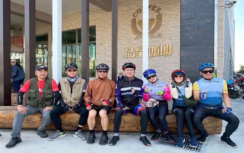 下一站來到 東山咖啡文化館。有人買鴨頭、有人喝咖啡,而最動人的畫面是—靖子、佩燕、郭大哥的歌聲在館內響起,翁教練還拿出口琴伴奏。旅途中的音樂,讓這段騎行像被加上一層柔軟的濾鏡。