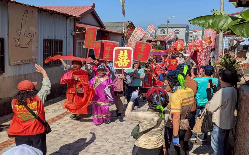 真正的大高潮,是抵達 菁寮嫁妝老街 的那一刻。街上熱鬧滾滾——媒婆、親家、新郎、新娘、扛轎隊伍、傳統音樂加上遊客 cosplay,彷彿整條老街都在為新娘送嫁。