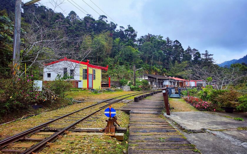 隨後抵達 水社寮車站。這裡最令人印象深刻的,是呈現「Ω」字形的軌道設計—火車從進站到出站正好轉彎 180 度,與二萬平站並列為林鐵中極具代表性的工程設計。對於喜愛鐵道故事的夥伴而言,這樣的細節,總能引起一陣低聲討論與讚嘆。