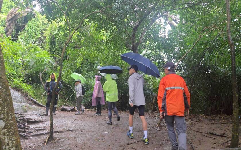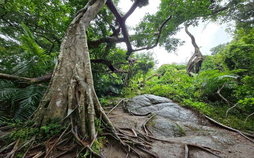 在導覽員 木棍 的帶領下,我們真正理解什麼叫做「會走路的樹」。白榕、雀榕隨著氣根落地、再生、移動,樹不是靜止的存在,而是緩慢行走的生命體。鑽樹洞、爬過由樹根築起的天然高牆、走在巨大岩石的稜線上,這些彷彿是童年遊戲的場景,卻在長大後被遺忘。今天重新拾回,笑聲在林間此起彼落。Tim 說,如果時間允許,他想再走三圈,逗得大家哈哈大笑。