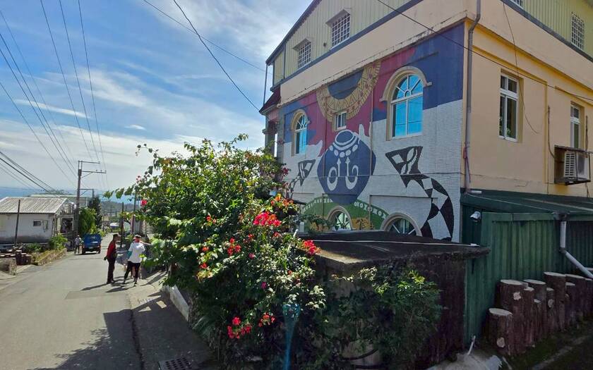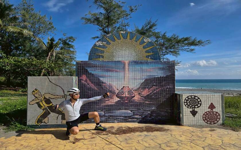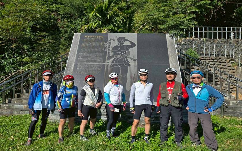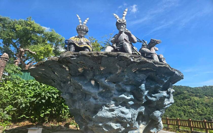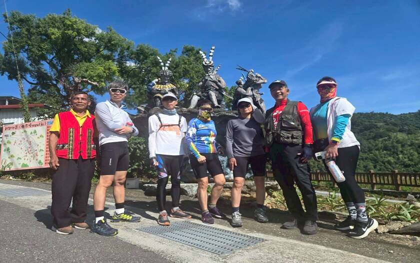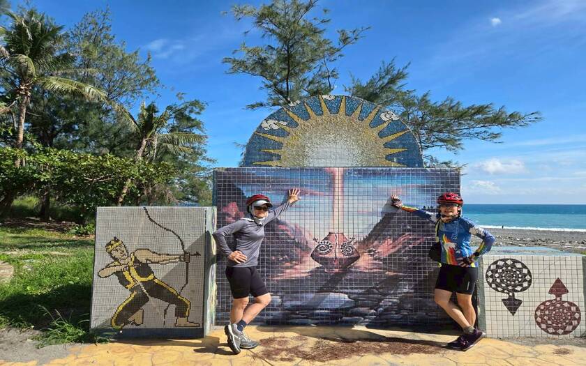 沿華原海灣前行,來到 太麻里曙光園區 留影後,11:20 完成今日第一段近 3 公里的長上坡挑戰,抵達 新興村撒布優部落(東排灣族)。部落座落在翠綠山林間,入口雕像遙望太平洋,象徵排灣族共榮共生的精神。