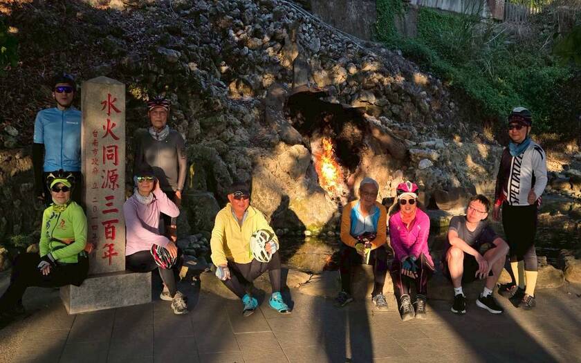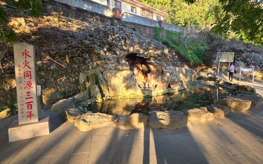 不遠處,便是關仔嶺最具代表性的自然奇觀——水火同源。由於特殊地質構造,岩壁中天然氣不斷冒出,點燃後火焰長明不滅,而岩縫間同時湧出泉水,形成「水中有火、火中有水」的罕見景象。在夕色漸沉的時刻停下腳步,更顯神秘而震撼。