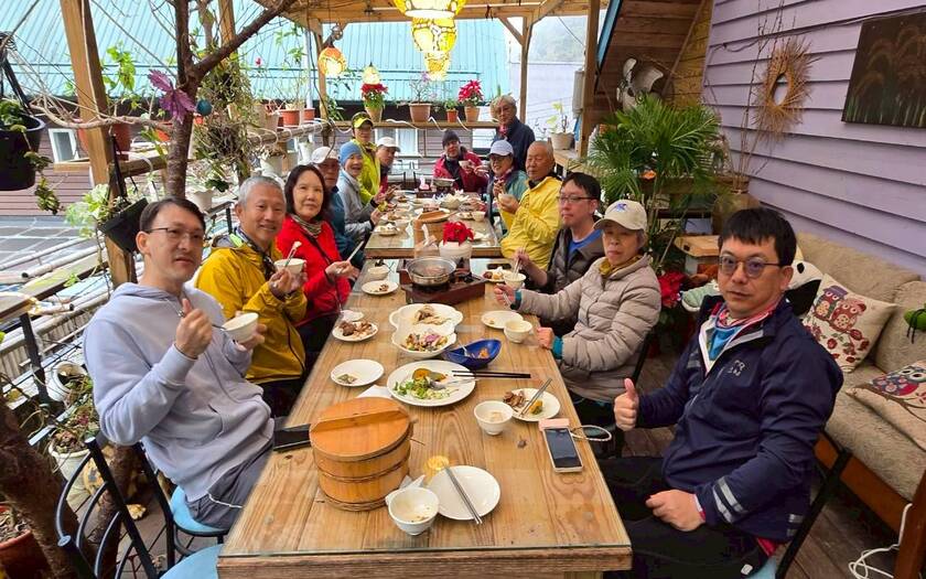 中午,享用湯蘭花表妹鄭小姐親手製作的鄒族風味料理。餐後,夥伴們自由走訪社區,喝咖啡、買麵包,在重建後的新聚落裡,感受生活重新站穩腳步的樣子。