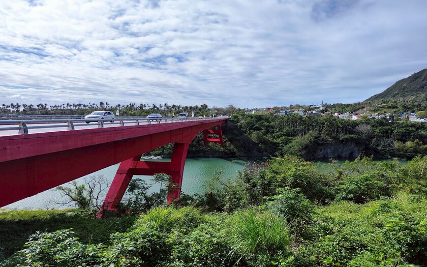 隨後騎抵 東河雙橋。一紅一灰,新舊並列—現代的東河新橋,與日治時期興建、列為歷史建築的東河舊橋相互呼應。橋下,是馬武窟溪切割出的壯麗曲流地形,白色的「帝王石」散落溪谷,藍天、碧水與地質景觀。