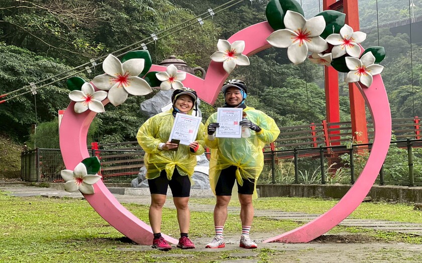 午後騎經菁桐天燈派出所,沿106景觀公路起伏前行,抵達石碇淡蘭古道雙溪口吊橋。紅色吊橋橫跨溪谷,在綠意間格外醒目。此刻,頒發環島證書——這不只是一張完成的證明,更是九天來汗水、堅持與彼此陪伴的凝結。每個人接過證書的那一刻,臉上都寫著同樣的答案:值得。