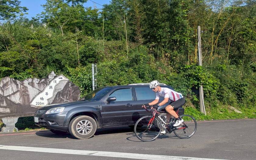 滑入羅浮、復興一帶,車隊在橋畔短暫停留,拍下第一張屬於北橫的合影。接著正式轉入台7線——這條橫貫山脈的經典路線,沒有華麗開場,卻用穩定的坡度與不斷延伸的山勢,慢慢拉開今天的序幕。氣溫升至29°C,但樹蔭濃密,風在林間流動,反而帶來一種恰到好處的涼意。
