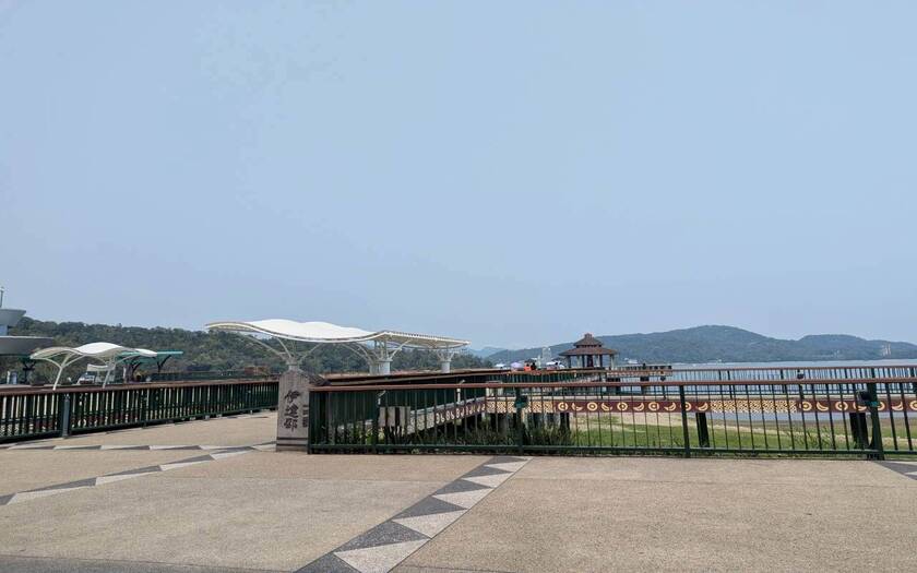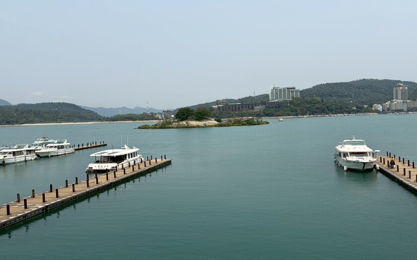 日月潭,就在腳下展開。湖水靜靜躺在群山之間,但細看之下,湖岸邊緣露出一圈金黃色的乾涸帶,像是一條繫在湖面的「金腰帶」。遠看詩意,近看卻提醒著水位的變化與現實。旅行,有時就是在美與真之間,看見更多層次。