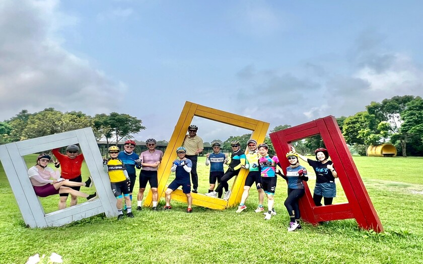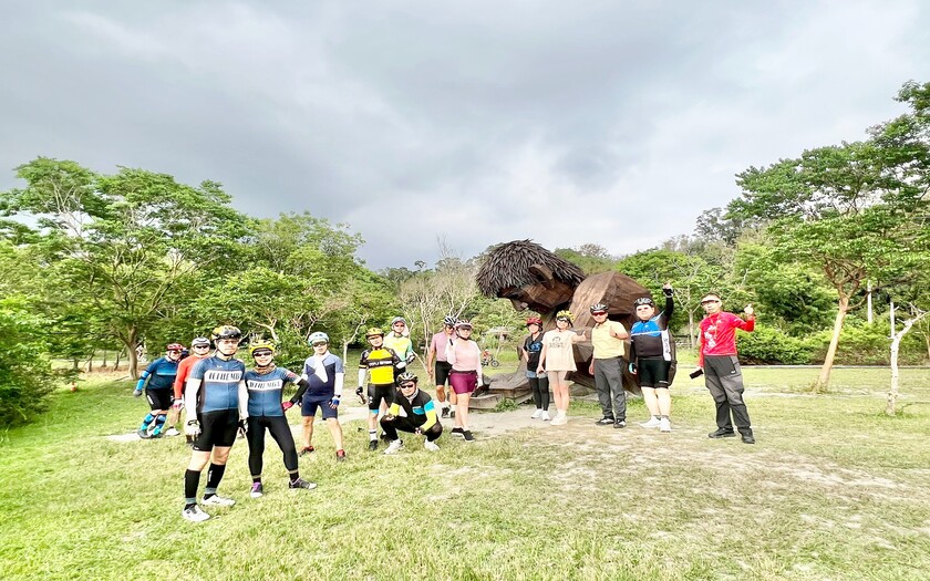 首先進入大農大富平地森林園區。這座台灣首座平地森林園區,綠意遼闊,林木筆直延伸,彷彿進入另一個世界。騎行在北環、南環自行車道之間,陽光從樹梢灑落,空氣中瀰漫著芬多精的清新氣息。沿途經過七彩釣竿橋與各式大地藝術裝置,讓森林不只是自然,更多了創意與活力。偶爾傳來鳥鳴聲,讓人不自覺放慢速度,沉浸在這片寧靜之中。