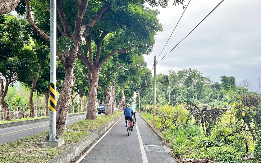 最後一段,騎進十股綠色隧道。兩旁八十年樹齡的茄苳樹交織成蔭,光影斑駁灑落在路面上。車輪聲在綠意之中迴盪,像是一段溫柔的告別。