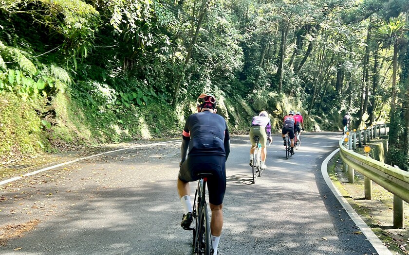 清晨 7:30,車隊從英仕山莊出發。一路穿越北橫檜木景觀公路,林蔭間透著涼爽晨風,八重櫻的枝影交錯,替騎士們鋪上詩意的起點。行經台7線 77K 時,特別停下來拍照留念,遠山雲霧飄渺,襯托著單車身影。隨後在明池山莊稍作休息,湖光山色靜謐如畫,讓人幾乎忘卻今日等待的長距離與高爬升。