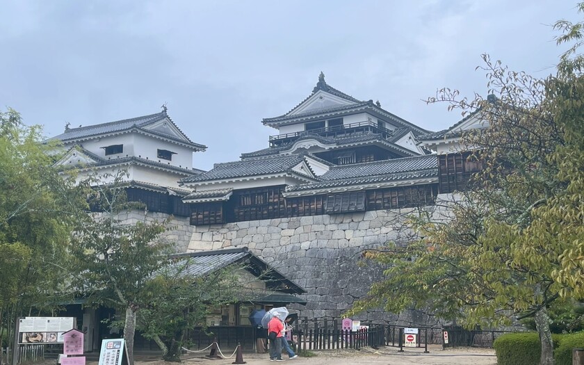 午後,我們來到松山市的象徵——松山城。這座城堡建於 17 世紀,是日本現存 12 座原始天守之一,至今已有四百年歷史,卻奇蹟般躲過戰火,完整保存。登上天守閣,可以俯瞰整個松山市,遠方的瀨戶內海在細雨迷濛下宛如墨畫。松山城同時也是日本最少數保有纜車與登山吊椅可直達山頂的城堡,登高過程中,古松與石牆交錯,讓人彷彿穿越時光,感受武士時代的威嚴氣息。