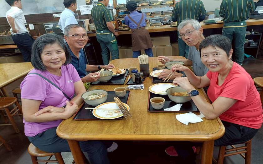 接近中午,我們在前往愛媛縣松山市的途中,特地停靠「山下烏冬」──一家外觀低調卻人氣滿滿的烏龍麵名店。這裡的特色是「半自助式」:先取茶水,再挑選熱騰騰的關東煮,接著從琳瑯滿目的天婦羅與壽司中挑選喜愛的組合,最後才是主角——晶瑩剔透、Q 彈有勁的讚岐烏龍麵。看似簡單的一餐,卻因豐富多樣的搭配,讓大家都端著滿滿的一盤,笑聲與食香充斥在小小店鋪裡,第一次深刻感受到「四國人的日常」也能如此樸實卻不凡。