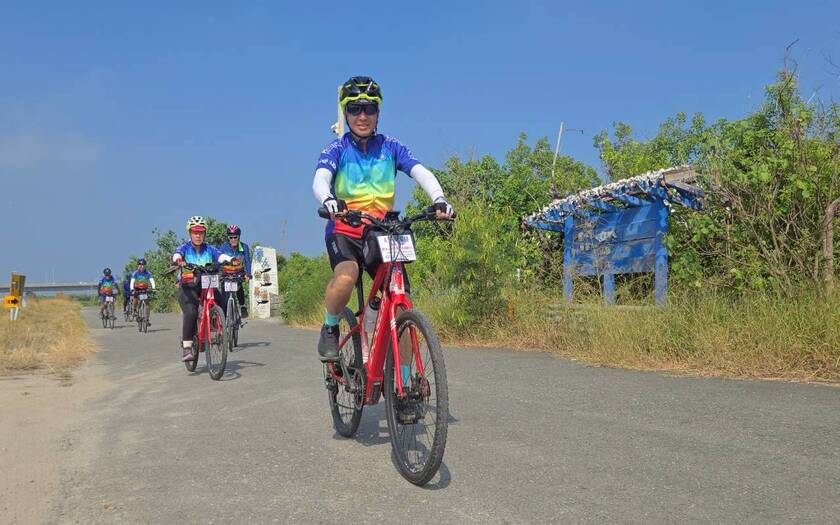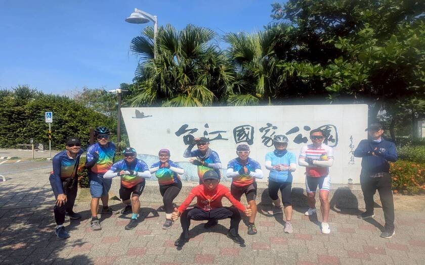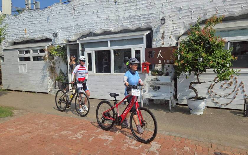 午後騎行進入 台江國家公園管理處暨遊客中心,這座白色高腳屋式的建築是嘉南平原上一道獨特風景。建築採高腳設計,保留原有魚塭與濕地環境,同時為底棲生物與水禽提供新的棲息空間。高腳屋結構既美觀又環保,象徵人與自然共生的理念,也讓此處成為全台第一座獲得「鑽石級綠建築」認證的行政機關。當午後的陽光映照在水面上,倒影與天光交融,一切都顯得靜謐而純粹。
