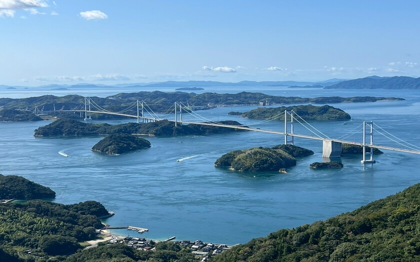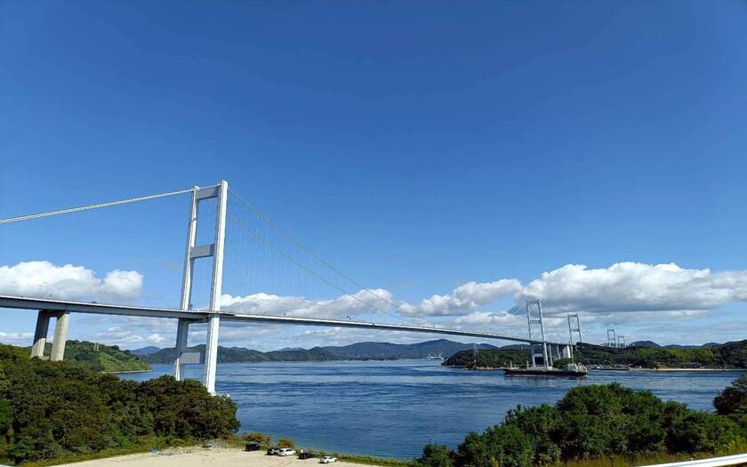 ○來島海峽大橋:世界最長三連吊橋,全長 4,105 公尺。從橋上俯瞰,瀨戶內海潮流翻湧如銀帶,壯闊無比。