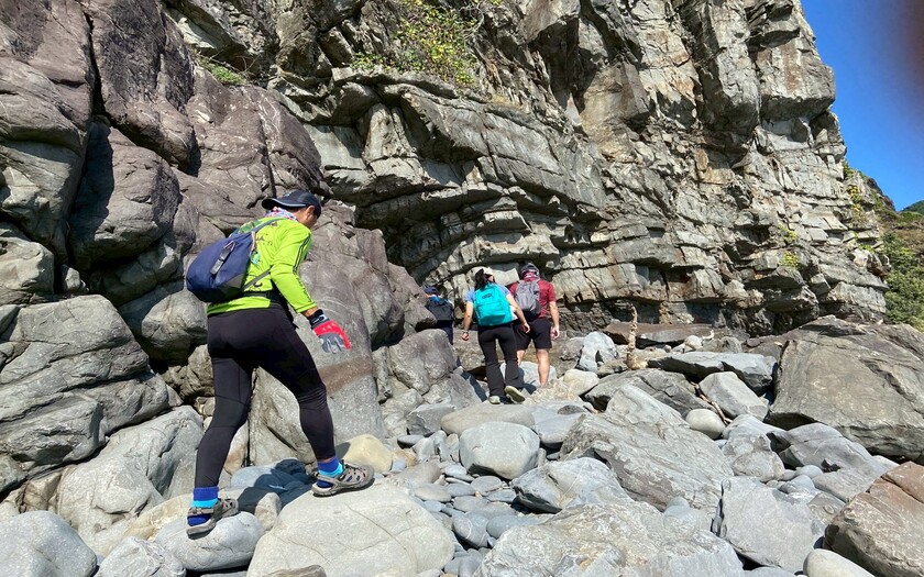 今日因颱風地形破壞,只能徒步部分路段,但也因此有機會以最原始的方式親近大自然。鵝卵石與礁岩交錯的路徑,蜿蜒於山海之間,腳邊浪花拍岸,耳畔傳來海鳥鳴叫。沿途經過壯觀的帆船石——又稱「棒球手套石」,從不同角度望去形態各異;再往前則是氣勢磅礡的軍艦岩,一塊巨石宛如駛向太平洋的戰艦,突入海中。站在岩邊遙望,一望無際的藍湛海面在陽光下閃爍,令人屏息。