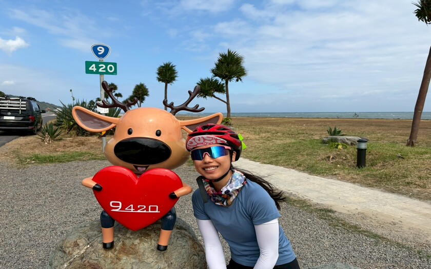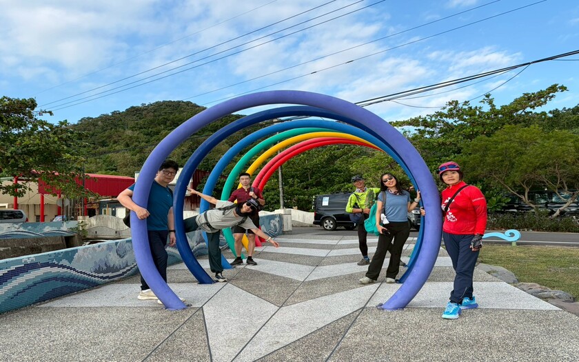 隨後展開今日的單車騎乘。海風迎面而來,伴隨著車輪的節奏,隊伍順著濱海公路北上。第一站是「多良觀光車站」——被譽為全台最美車站之一。車站原是排灣族「打腊打蘭社」舊址,如今屋頂改為觀景平台,從鐵道望出去,太平洋遼闊無垠。火車緩緩駛過,紅色車廂與碧海藍天交織成無與倫比的風景。