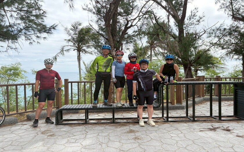9:40結束導覽返回飯店整裝,十點整展開今日的最後一段騎行。第一站是【華源海灣觀景台】——台東沿岸最新的觀海據點,建於舊台9線上。站在平台上,眼前是無垠的湛藍海線,遠方綠島、蘭嶼浮於海霧之中,如幻似真。海風輕拂,夥伴們紛紛停下腳步,拿起手機記錄這片「華源曙光」的壯麗。