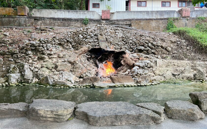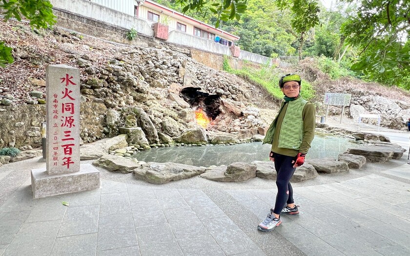 第一站來到「水火同源」。崖壁中湧出的天然氣遇火便長明不熄,而泉水又恆定地從縫隙中奔流而下,形成「火在水中跳躍、水在火旁冒煙」的奇異景象。濕氣在熱度之間飄成白霧,像是大自然的呼吸。領隊在此講述枕頭山因形似高枕臥眠而得名、火山碧雲寺在清代時便是周邊農人的精神依靠,「半壁吊燈」「火麒麟穴」「出米洞」等傳奇更讓整座山脈多了神話色彩。短短一個地點,既有地質奇蹟、又有民間傳說,是嘉南最具特色的自然劇場。