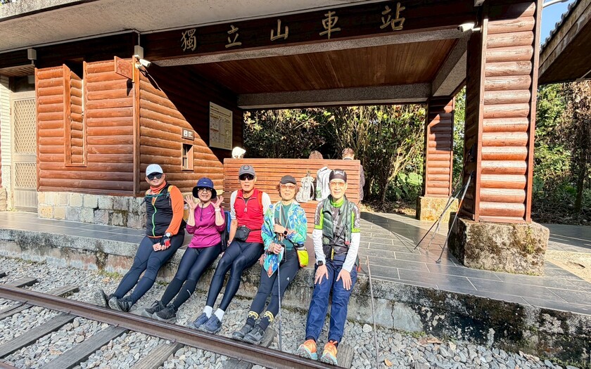 約下午 1 點抵達 樟腦寮車站。這座折返式車站以 × 形軌道設計聞名,火車後退進站、再垂直爬升,完整展現「螺旋式」工程工法,是林鐵繞行獨立山三圈的經典路段。在此收車後,隊伍改以雙腳踏上 獨立山步道。獨立山步道依山勢自然鋪設,是全台少見與鐵道並行的登山路線。行走其間,火車、隧道、鐵軌與山嵐不時交錯出現,清霧忽左忽右,讓人一再停下腳步。這段路,不快,卻讓人走得心甘情願——因為知道,這正是加碼旅程最珍貴的部分。