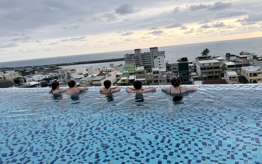 下午16:00,車隊順利抵達枋寮枋客文旅。頂樓的無邊際泳池,成為今天最療癒的終點。夥伴們換上輕裝,浸入池水之中,遠方海平面與天空連成一線,所有疲憊在此刻慢慢釋放。