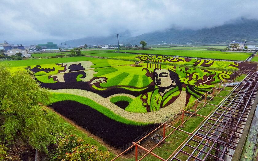 而在米國學校旁,一片令人驚艷的「天后阺家」彩繪稻田映入眼簾——以媽祖庇佑與農作祈願為靈感,透過六色彩葉稻拼繪出壯觀圖騰,隨著風起稻浪微動,彷彿讓信仰與土地在眼前交織成一幅流動的畫。
