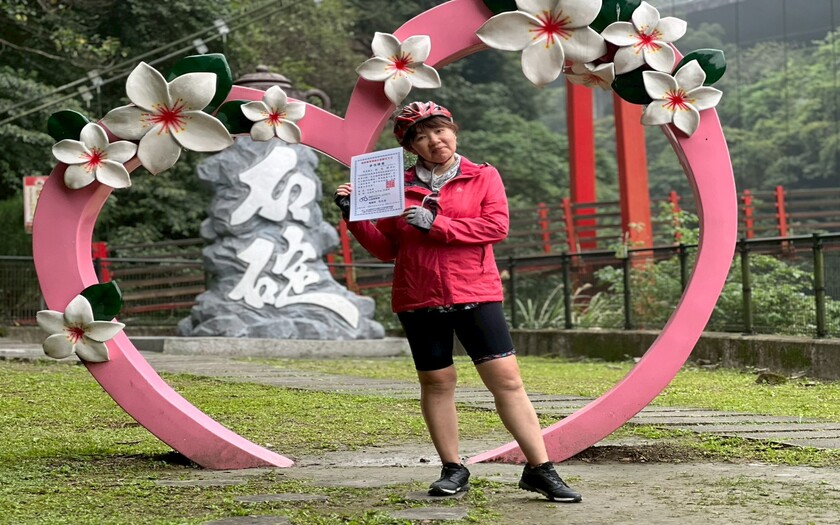 午後騎經菁桐天燈派出所,沿106景觀公路起伏前行,抵達石碇淡蘭古道雙溪口吊橋。紅色吊橋橫跨溪谷,在綠意間格外醒目。此刻,頒發環島證書——這不只是一張完成的證明,更是九天來汗水、堅持與彼此陪伴的凝結。每個人接過證書的那一刻,臉上都寫著同樣的答案:值得。