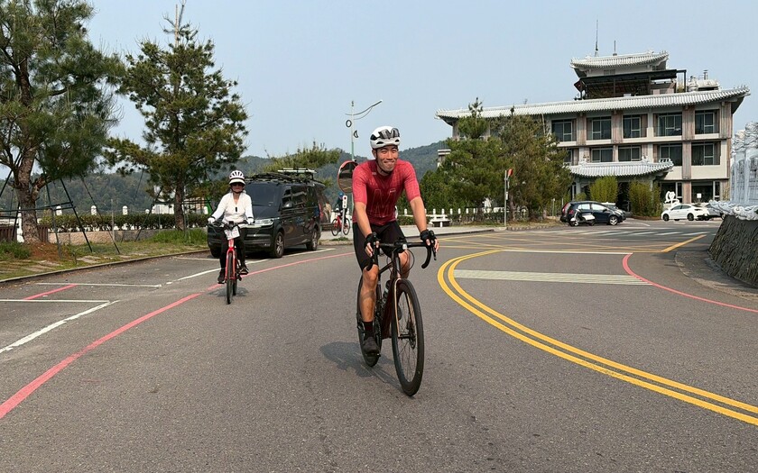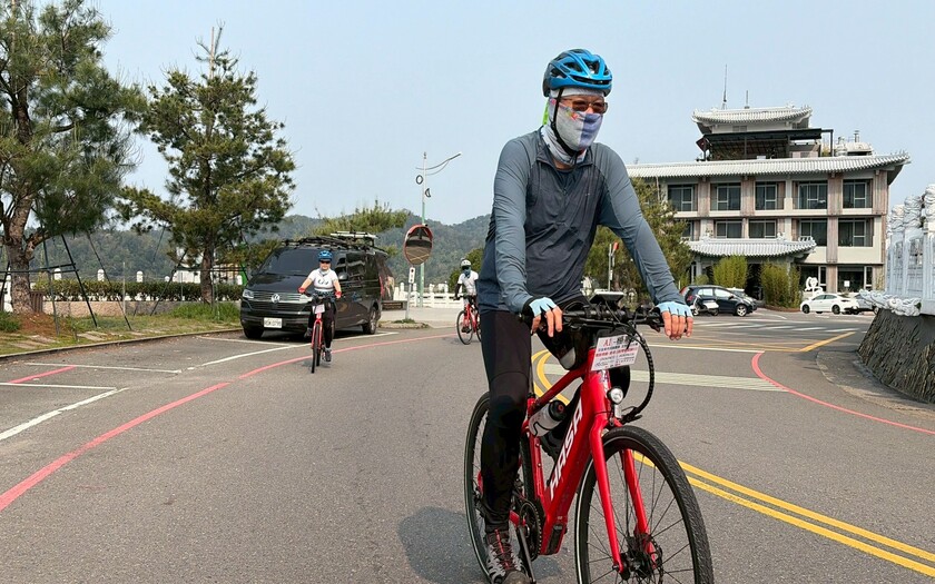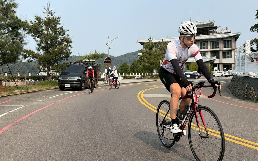 第一段爬坡很快讓身體進入狀態。汗水沿著臉頰滑落,呼吸逐漸加深,直到抵達慚愧祖師廟,才終於有了停下來的理由。廟埕前,葉教練講起祖師的故事——以「慚愧」自省,以謙卑為修行。這份向內的提醒,在剛經歷爬坡的我們心中格外有重量。騎行,有時也是一種修行。