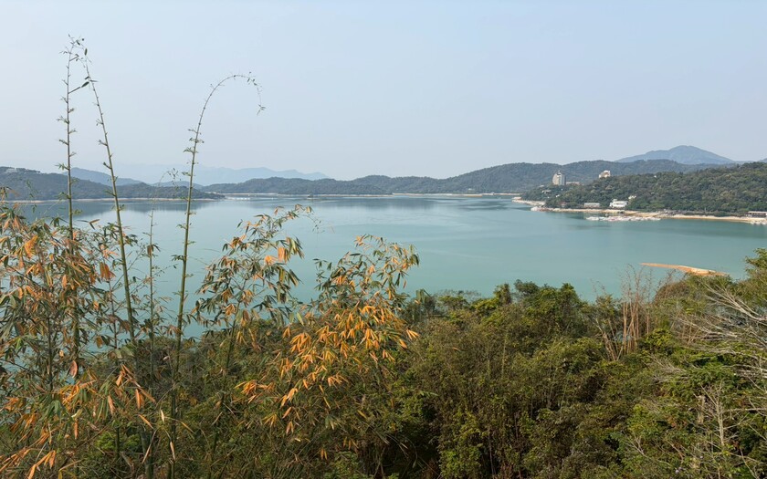 日月潭,就在腳下展開。湖水靜靜躺在群山之間,但細看之下,湖岸邊緣露出一圈金黃色的乾涸帶,像是一條繫在湖面的「金腰帶」。遠看詩意,近看卻提醒著水位的變化與現實。旅行,有時就是在美與真之間,看見更多層次。