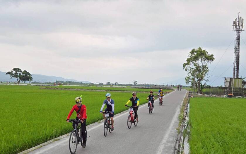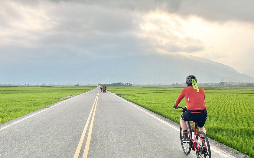 再往前騎抵池上大坡池,湖面平靜如鏡,倒映著藍天與遠山。這裡的水,滋養著整片縱谷,也孕育出聞名的池上米。