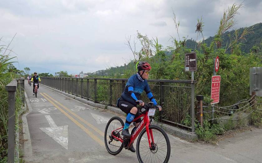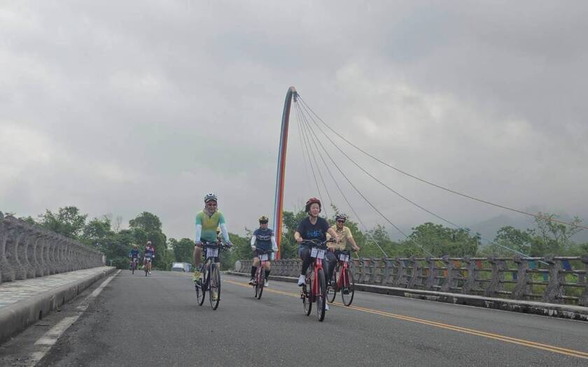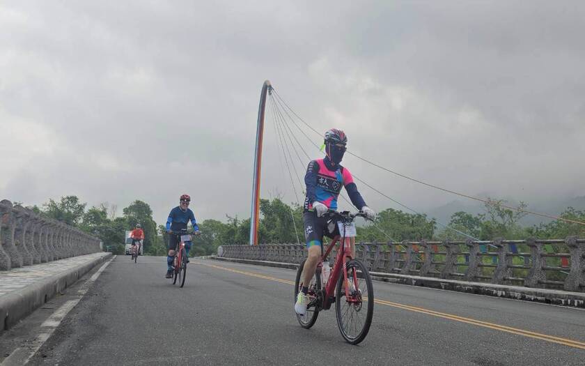 接著轉入玉富自行車道,來到舊鐵道橋上。腳下這一段,看似平凡,卻是世界級的地理奇點——歐亞大陸板塊與菲律賓海板塊的交界處。全世界僅有少數地方能在陸地上跨越板塊,而此刻,夥伴們用雙輪完成了這項壯舉。現場頒發「跨越台灣奇點・世界騎跡挑戰證」,這不只是紀念,更是一段專屬於這趟旅程的榮耀。