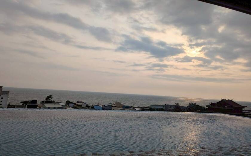 傍晚,無邊際泳池與海平面連成一線,夕陽把每個人染成金色。